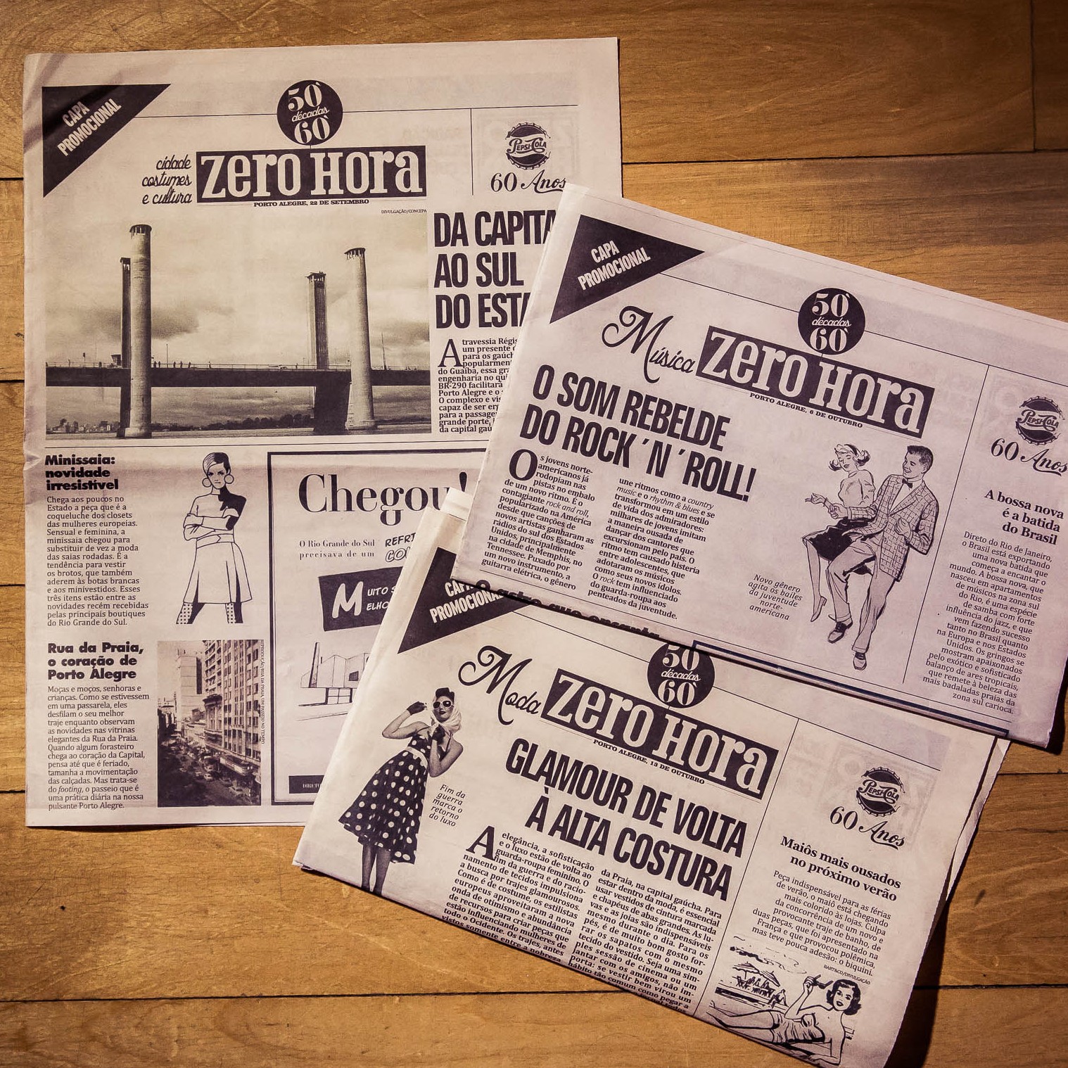 Para marcar os 60 anos da Pepsi no Brasil, embalamos três edições dominicais de Zero Hora com publieditoriais que recriavam as notícias que seus avós liam.